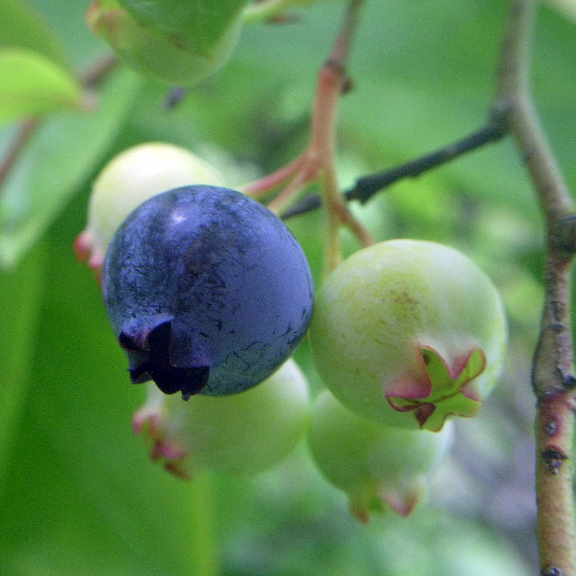 - Beautiful upright blueberry bush bears large blue-purple fruit in early summer